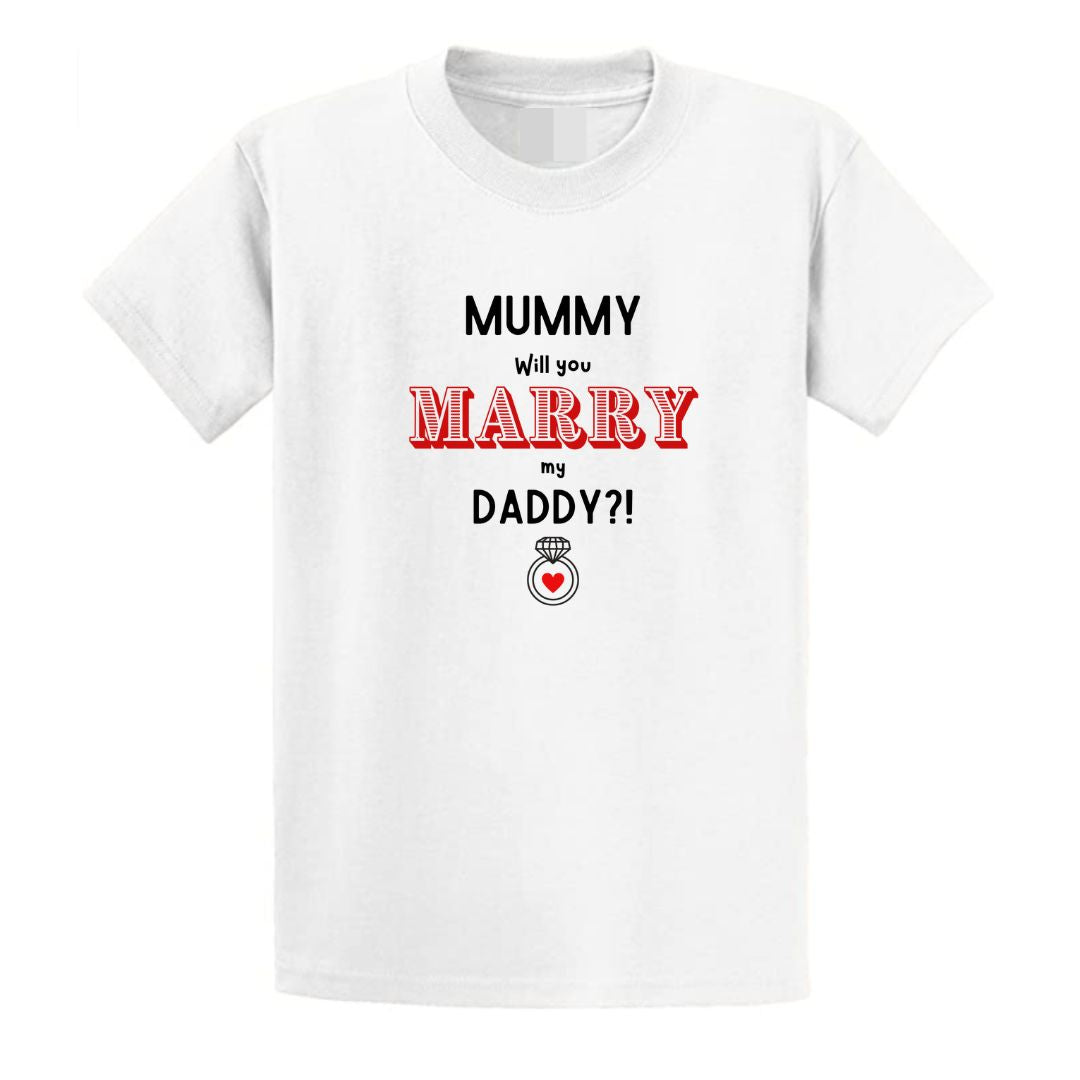 Shortsleeve baby/childrens t shirt. Mummy will you marry Daddy design. Made from 100% cotton. Available in various sizes. Wash garment inside out, do not iron on top of print. Designed and made by Second Ave Gift Company in our Essex based workshop. Search for Second Ave Gift Company to see our full range of gift ideas.