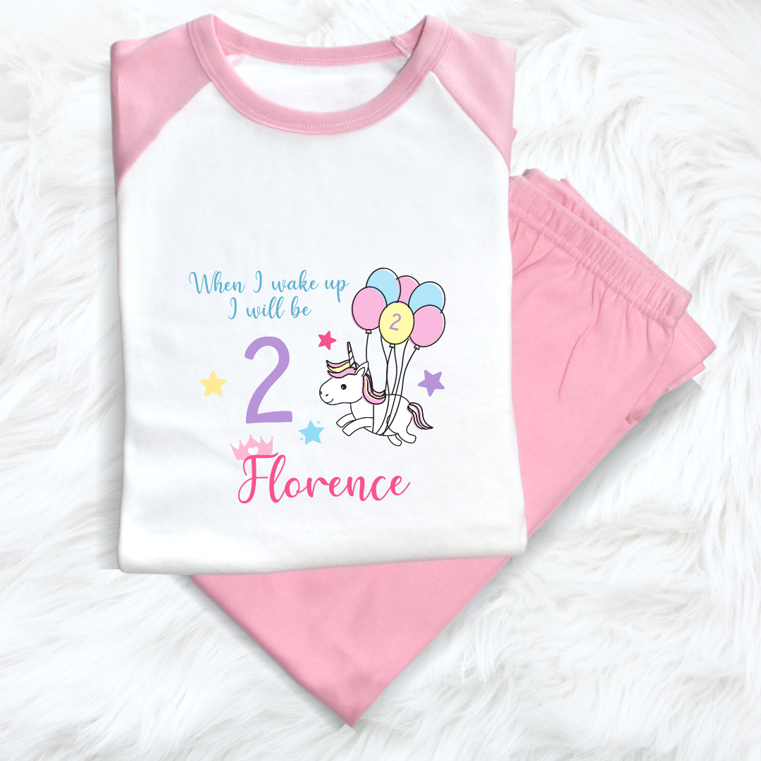 Second Ave Personalised Name Age Unicorn Children's Kids Birthday Pyjamas PJ's Pink/White